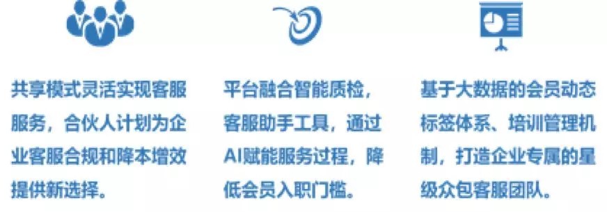平臺具備眾包運(yùn)營、云端平臺、質(zhì)量管控、培訓(xùn)認(rèn)證、精準(zhǔn)營銷、智能客服六大功能要素。通過AI賦能共享,實(shí)現(xiàn)市場人力資源與企業(yè)客服需求的高低峰匹配。