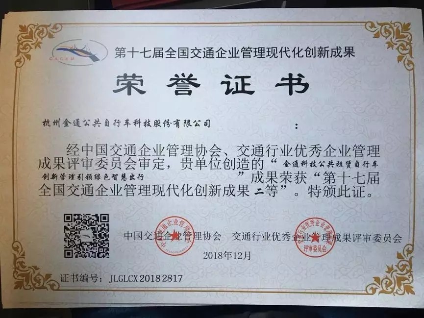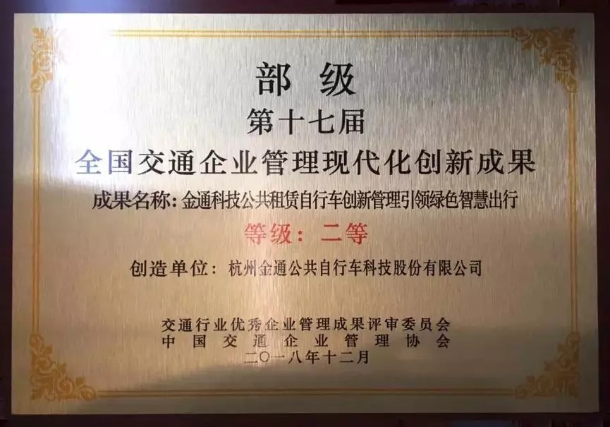 2019年3月14日,中國(guó)交通企業(yè)管理協(xié)會(huì)在山東濟(jì)南市召開(kāi)了“第十七屆交通企業(yè)管理創(chuàng)新年會(huì)”。會(huì)上公布了第十七屆全國(guó)交通企業(yè)管理現(xiàn)代化創(chuàng)新成果和示范單位,并對(duì)獲獎(jiǎng)單位和主創(chuàng)人進(jìn)行了授牌,金通集團(tuán)提交的《金通科技公共租賃自行車(chē)創(chuàng)新管理引領(lǐng)綠色智慧出行》榮獲第十七屆全國(guó)交通企業(yè)管理現(xiàn)代化創(chuàng)新成果二等獎(jiǎng)。